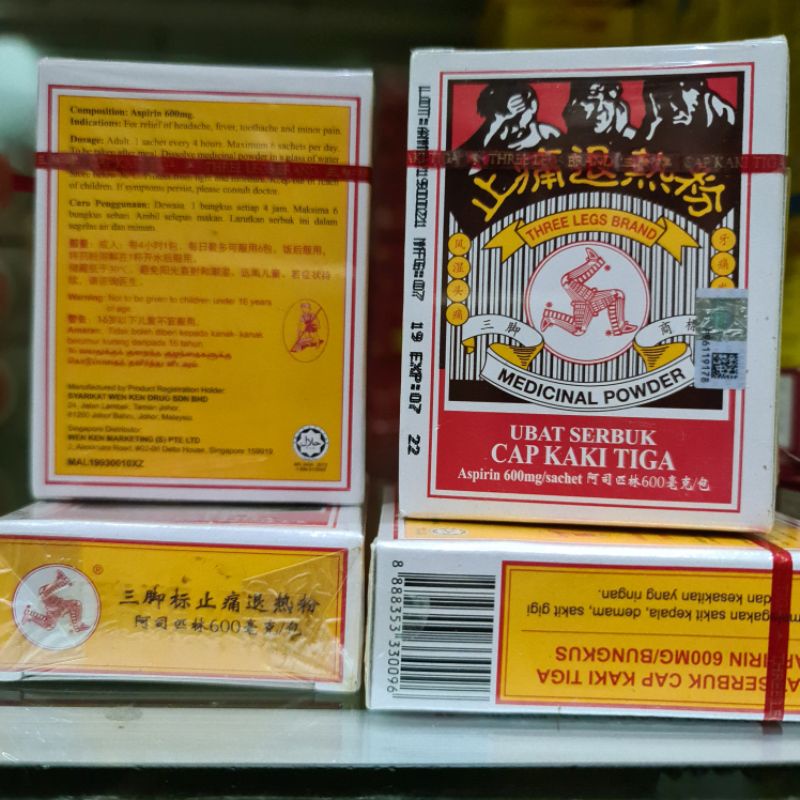 Three Legs Brand Medicinal Powder - Ubat Serbuk Cap Kaki Tiga 止痛退熱粉 10s quantity. Obat kurap Cap Kaki 3 merupakan larutan dengan isi benzoic acid yang berperan sangat penting buat menanggulangi gatal yang diakibatkan peradangan jamur serta bisa meringankan penyakit kulit semacam kurap serta pruritus. Namun peran dan efektivitasnya tidak dapat menggantikan obat-obatan.